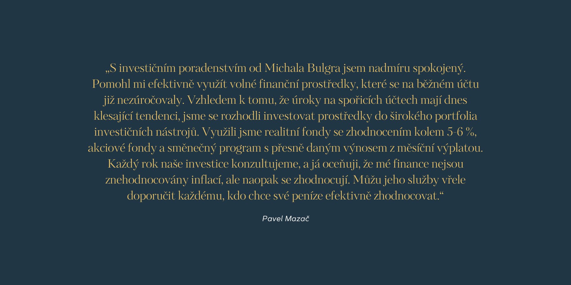Pro mě osobně je velice důležité pracovat profesionálně, ale zároveň lidsky. Lidé jsou přesyceni namyšlenými poradci, proto se snažím službu dělat trochu jinak.
